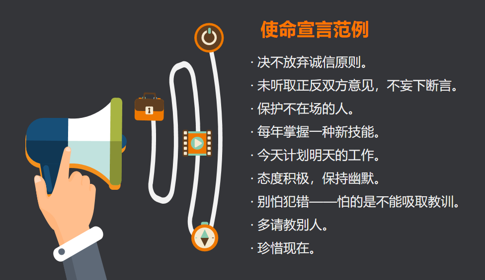 以终为始最有效的方法,就是围绕自己的个人原则撰写一份个人使命宣言(俗话说的立个Flag),即人生哲学或基本信念。