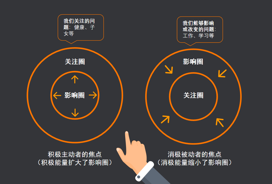 关注圈,是指我们关注的问题,包括健康、子女、世界局势等。影响圈,则是指我们能够影响或者改变的事情,比如学习、工作。而有些事情是我们关注,但无法影响的,比如石油危机、战争、飞机失事等,这些事情就属于关注圈而不属于影响圈。