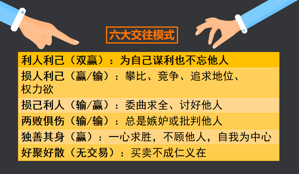 双赢不是什么技巧,而是人际交往的哲学,是六个交往模式之一,这六个模式分别是: