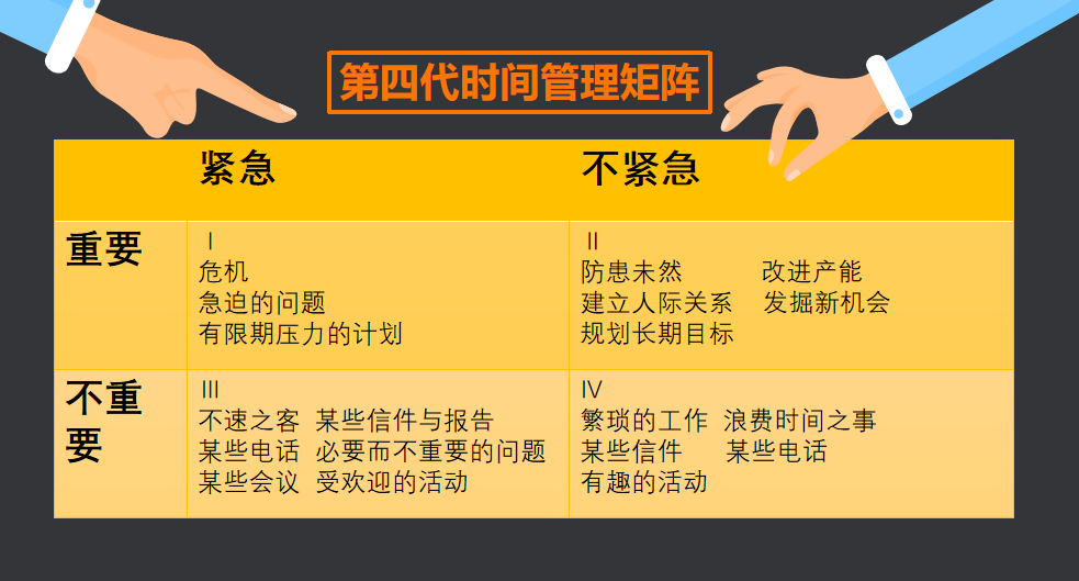 第四代时间管理矩阵,它主张关键不在于时间管理,而在于个人管理。与其着重于时间与事务的安排,不如把重心放在维持产出与产能的平衡上。根据个人管理理论,将耗费时间的事务依据紧迫性与重要性分为四类。